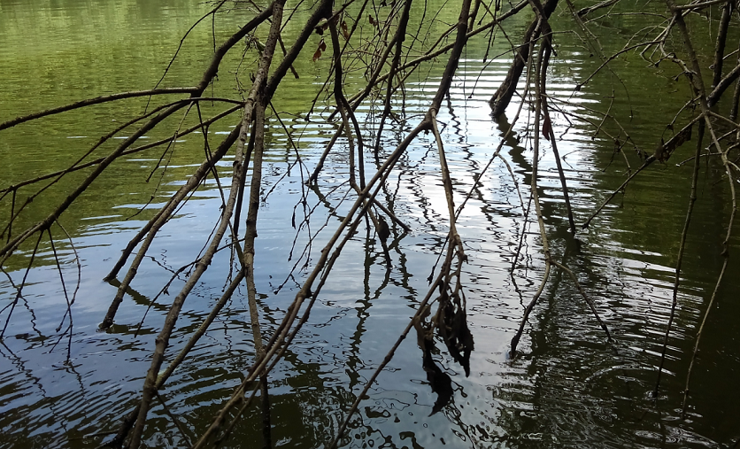折れた木がぶら下がって、枝が水面に突き刺さっている状態です。