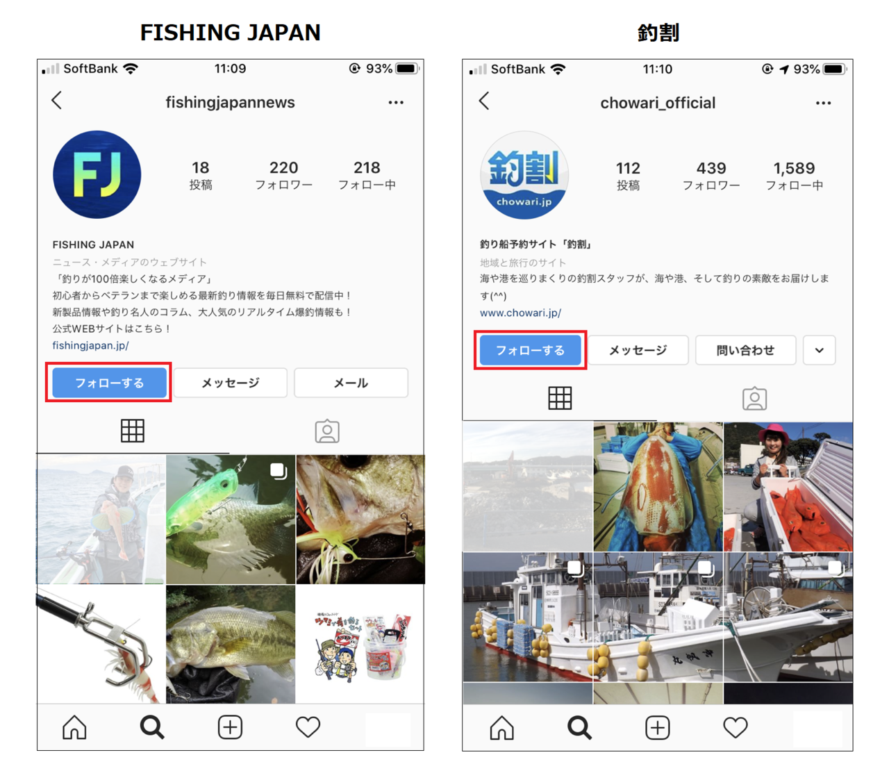 下のリンク先からFISHING JAPAN または 釣割の公式Instagramページを表示し、「フォローする」ボタンをタップしてください。