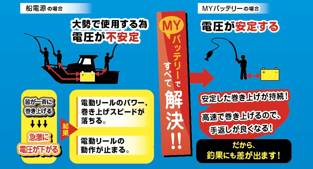 特に深場の釣りで電力消費の大きい大型リールを使う場合、電圧が不安定になりやすく動かなくなる恐れもあるのでバッテリーの持ち込みを推奨している釣り船も多いです。