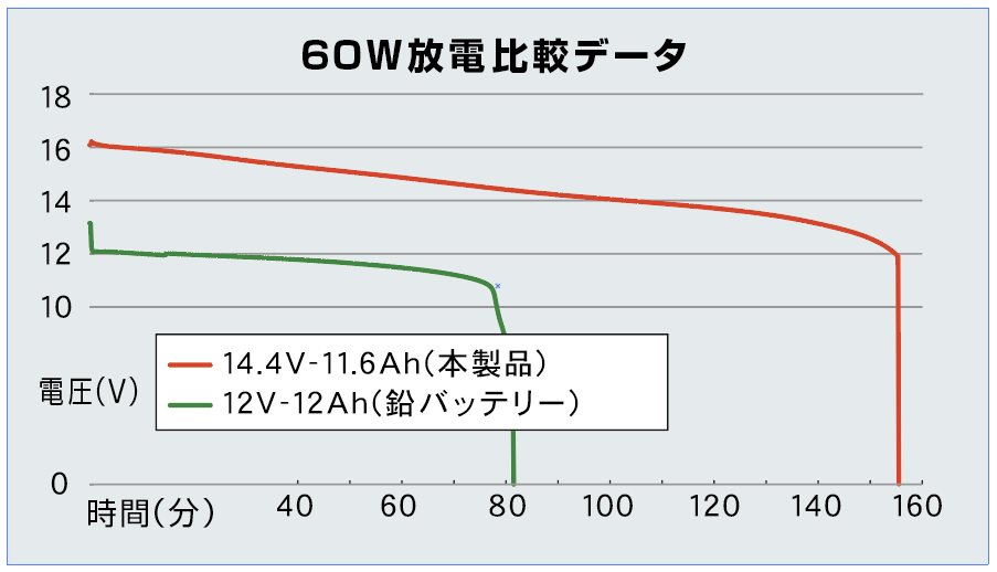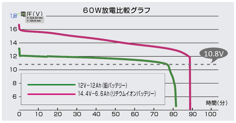 一度の充電で鉛バッテリー12Ahより長い時間の使用が可能であるにも関わらず、重さはその1/5以下という脅威の軽量設計を実現しています。