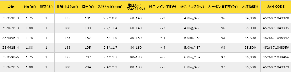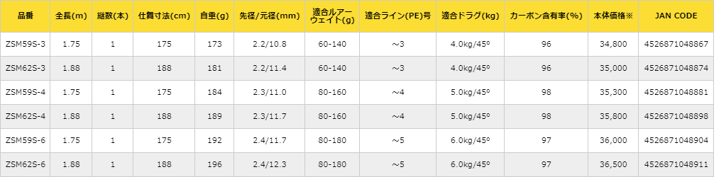 ゼロシキマッハ3にはスピニングモデル6種とベイトモデル6種の全12種のラインナップがあります。