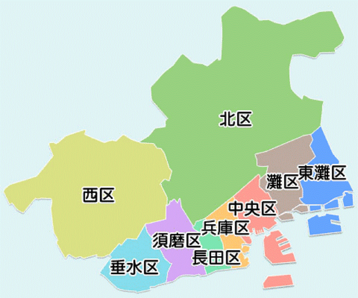 神戸市は兵庫県南部に位置し、灘区・東灘区・兵庫区・中央区・垂水区・須磨区・長田区・北区・西区の9区から成る、兵庫県内最大の都市であり、なんとそのうち北区、西区を除く7区が海に面しています。