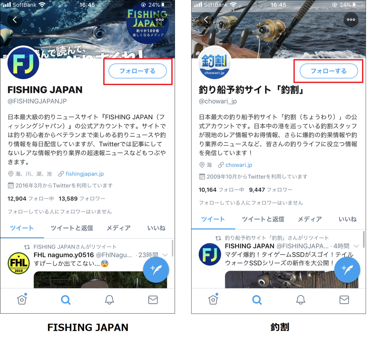 下のリンク先からFISHING JAPAN または 釣割の公式Twitterページを表示し、「フォローする」ボタンをタップしてください。