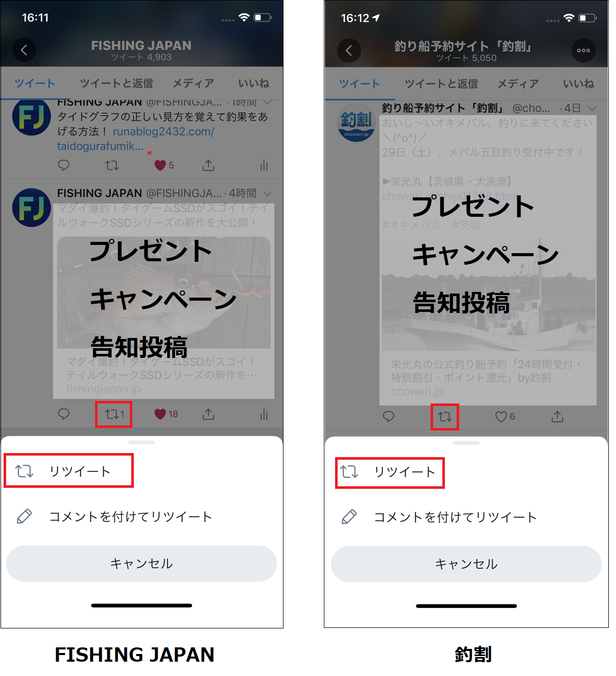 FISHING JAPAN または 釣割 の公式Twitterアカウントをフォローして『プレゼントキャンペーン』告知投稿をRTしてください。