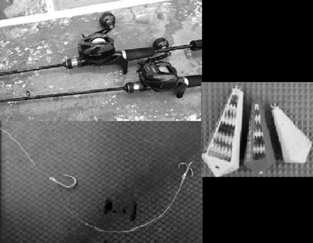 (左上)取材時に鈴木新太郎さんが使用した竿はシマノのエキサイトゲームCI4+タイプ73M195、リールはバルケッタFカスタム150をセット。(左下)ハリの結び方は孫バリが移動結び、 親バリが小物結び。親孫の間隔は12~13cm前後。(右)オモリは40、60、80号を使用。早朝の暗い時間はホログラム付きの夜光のオモリを使う。