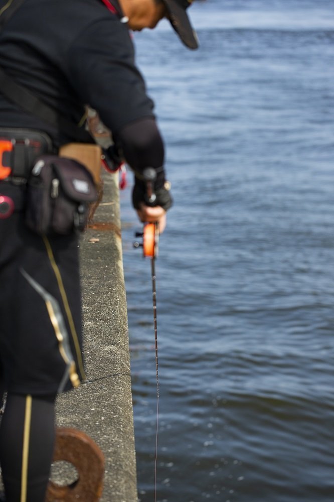 そうして岸際ギリギリにイガイを落とすと、スプールをゆっくりと指ではじきながら、糸を送り込んでいく。