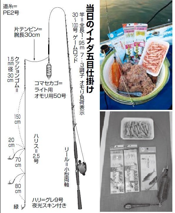 (上)ハリス3号前後の 擬餌バリ仕掛けがメ インだが、先バリが 空バリのタイプはオ キアミを付ける。コ マセカゴはライト用 でオモリ50 号(下)仕掛けや付けエサ用のオキアミは船宿 で販売