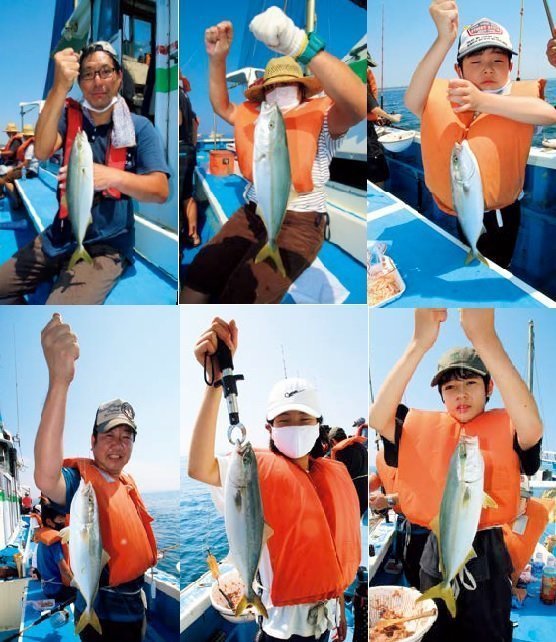 (左上)小さくてもブリの若魚だけあって引きはパワフル(中上)今のところ 30~40 cm級主体(右上)小学生も自力でキャッチ(左下)子供をサポートしながらお父さんもゲ ット(左中)イナダはユッケ風の刺身がおすすめ(左下)スキン巻きの仕掛けでヒット