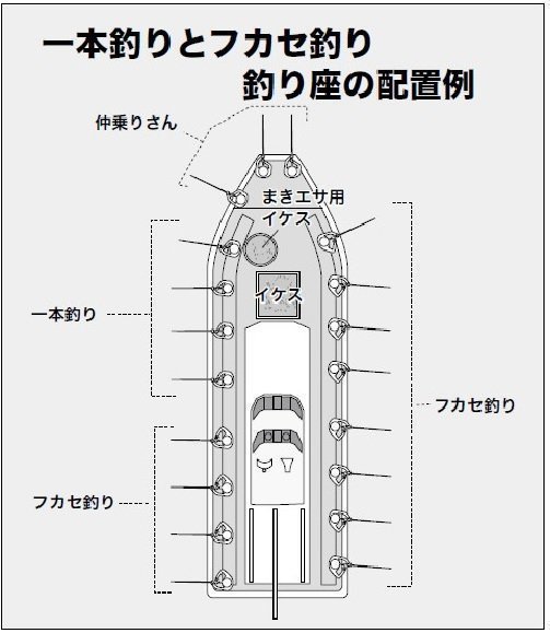一本釣りなら左舷ミヨシ側、フカセ釣りなら右舷側と左舷トモ側となるので、当日の自分の釣法に合わせて釣り座を決めることだ。