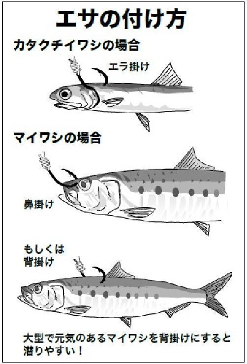 イワシの付け方はマイワシであれば鼻掛け、カタクチイワシであればエラ掛けが基本。