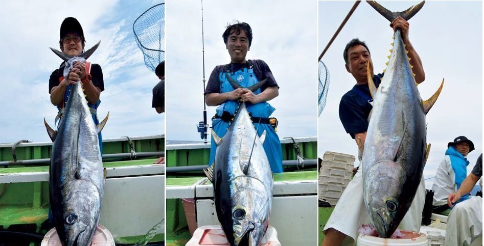 (左)貸し道具でトライした関口さんが 26kgをゲット(中)写真左、関口さんの義理の息子、市川さんも23kgを釣り上げた(右)ベテランの園部さんは余裕で2本キャッチ