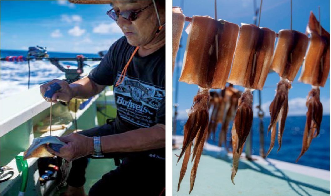(左)沖干し作りに精を出す(右)沖干しもうまいが、刺身も絶品