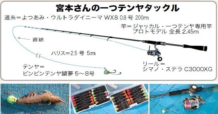 宮本さんはこの釣りの黎明期からのめり込み、最大9kgを筆頭にこれまで数かずの大ダイを釣り上げ、業界初のタングステン製テンヤ「ビンビンテンヤ」や「ビンビンテンヤ鯛夢」、一つテンヤ専用ロッド「鯛夢」などをプロデュース。