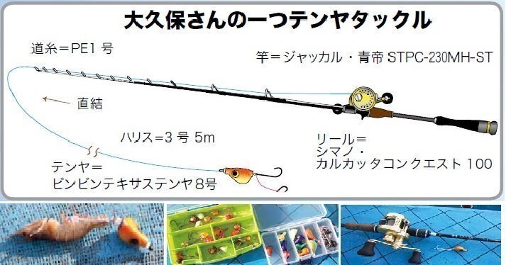 (左下)テンヤはノーマルのテンヤと遊動テンヤの特徴を併せ持つジャッカル「ビンビンテキサステンヤ」でスタート(中下)テンヤのカラーはオレンジや赤などの暖色系を中心に、夜光、グリーン、パープルなど様ざまな色を使う(右下)大久保さんはベイトタックルを愛用。当初はスピングタックルを使っていたそうだが、ベイトタックルのほうがサミンが容易でテンヤの着底が分かりすいとのこと