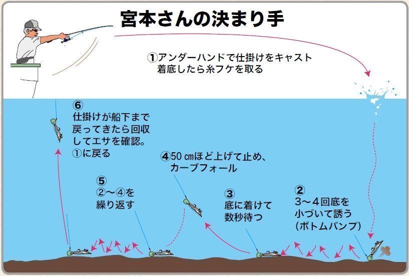 少し重めのテンヤでしっかりと底ダチを確認し、底部近くをリフト&フォールで丁寧に調べましょう!