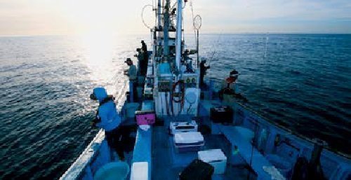 8月7日、午前4時半に集合し、釣り座決めのジャンケンで勝った大久保さんが右ミヨシに入り、隣に宮本さんが並ぶ。