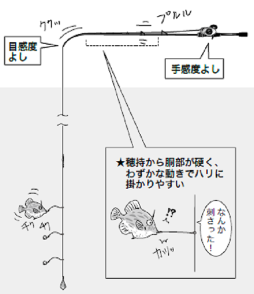 ●ハリ掛かり率アップ=穂持が硬めで胴にかけての張りも強いため、ハリを口にしたカワハギがカツッとオートマチックで掛かりやすい。