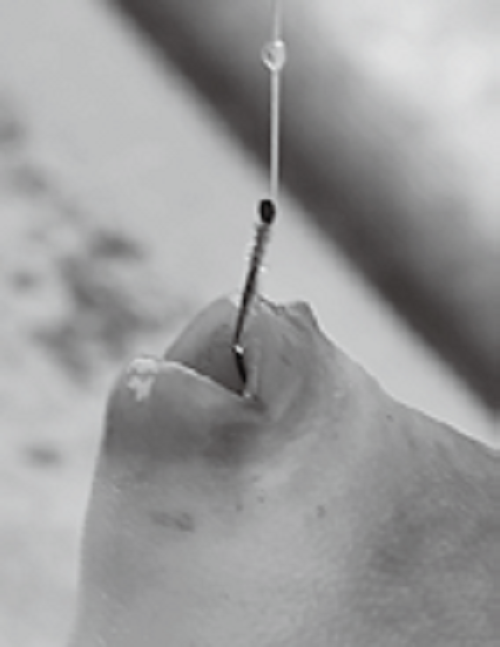 上下左右に泳ぎ回って逃れようとするカワハギの口にしっかりハリ掛かりさせて、バラシを防ごう。