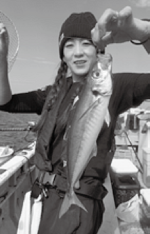 彼氏の橋本さんとタモを持った仲乗りさんが「がんばれ、がんばれ!」と声援を送り、なんとか1㎏級のイナダを釣り上げた。