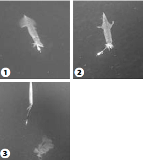 ①いい位置に掛かっているように見えるが②仕掛けが揺れた拍子に触腕掛かりになり③墨とともに勢いよく噴射して逃亡
