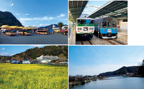 (左上・右上)伊豆急下田駅から手石まではバスで30分ほど。(左下)南伊豆町日野の菜の花畑。(右下)弓ケ浜大橋から見る青野川河口。