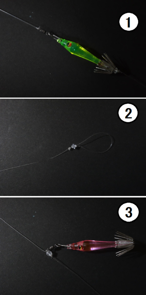 ①が直結仕掛けを構成する接続パーツ。小型のスイベルに「イカフック」を使ってスッテの上部につなぎ、②のようにケイムラビーズを通したユニノットループでカンナ側を接続。直ブラにスイッチする時は、ビーズをつかんでループを広げ、③のようにユニノットループをスイベルの結束部で固定すれば、すぐに仕掛けを変えられる。パターンの変動が激しいマルイカならではの仕掛けである