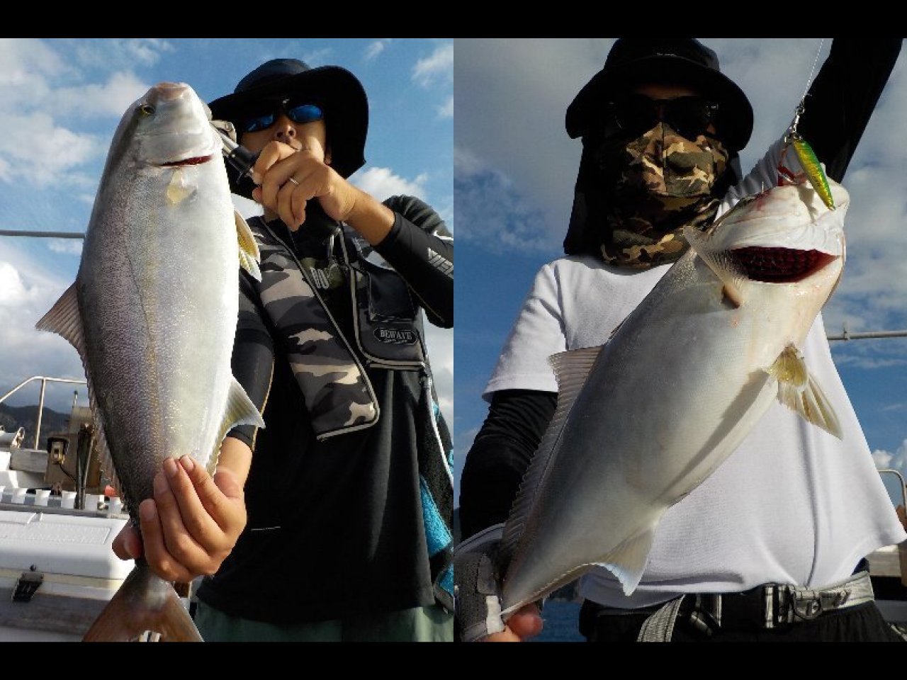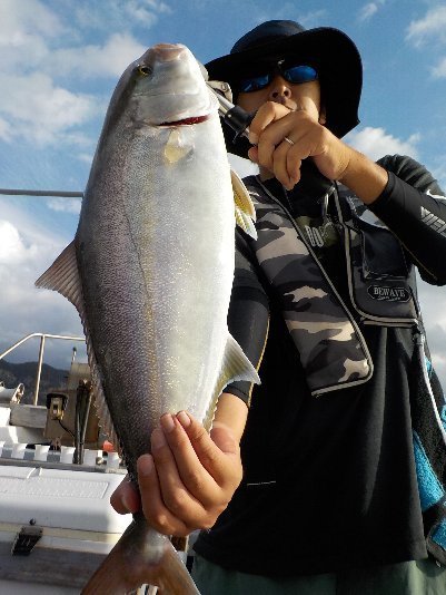 ・海上は南寄りの風でやや波が高く、時々雨の降るあいにくのお天気に。ベイト(小アジ)の反応は良好で、サビキにエサの掛かりもよく、60cmオーバーのカンパチも混ざり、カンパチは高活性で好釣でした!