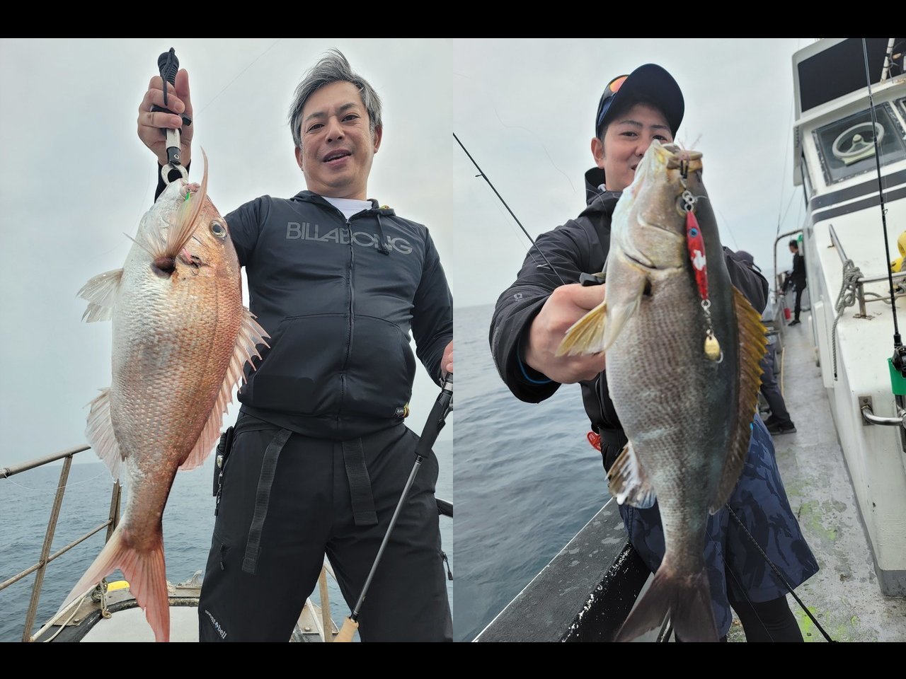 ・ 雨風の中SLJにイサキ狙いで出船!朝イチ良型の真鯛!イサキとバタバタHITしました!