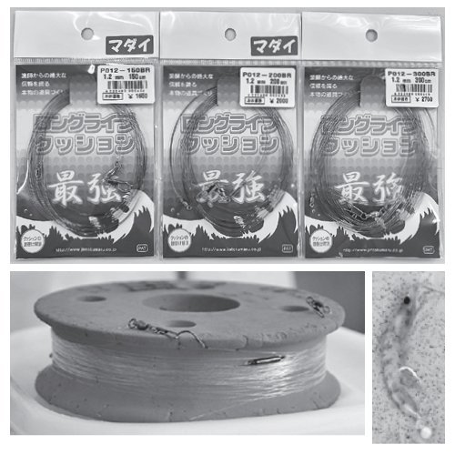 (上)マニアの間では定番となっている2mのクッションゴム。人徳丸のロングライフクッションは3mなど、長さのバリエーションが豊富(左下)-2Bのウエイトスイベルを仕掛け中間付近にセットしたテーパー式は、中間まで素早く沈み、その先はゆっくりなじむ。傷んだときに交換が早く、節約にもなるのも長所(右下)ハリは無塗装(銀)、金、ケイムラ、フッ素コート黒など様ざま。写真は「真鯛王ケイムラパール」10号。チモトに小さなソフト玉、その上にパールをセット。これで3.7kg含め3枚キャッチ
