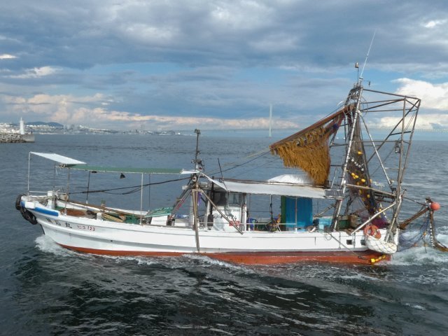 船体には漁船の名残があり、デッキに屋根が付いていたり後方に底引き網が装備されていたりします。