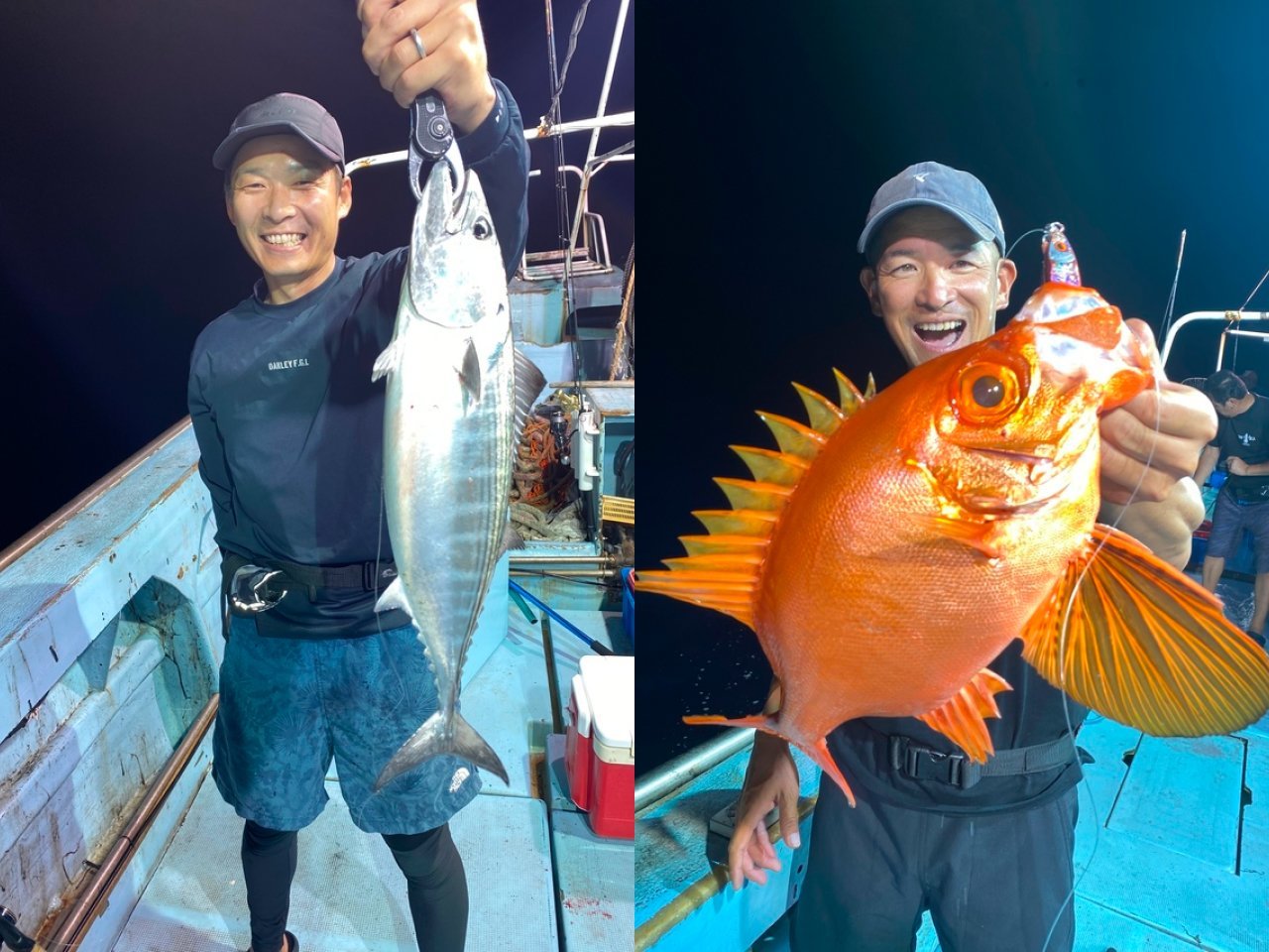 ・大型鯖からハガツオ、真鯛と多種釣れてましたね。ジグのスローかフォール中によく当たっていたそうです!イカは魚が多いからなのか 厳しい状況でした。