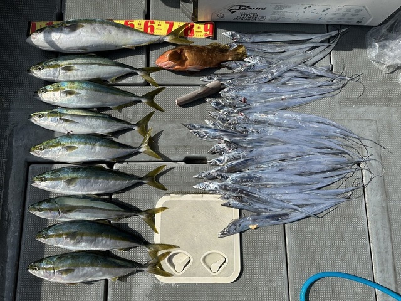 ・約1時間半ほど釣ったところで、ポイント移動して、太刀魚を釣りに向かいます。太刀魚も到着後すぐに釣れました!今回はジギングで太刀魚に挑戦されていました。ブチブチとジグを切られて、皆様苦戦されていらっしゃいました。ここでも約60匹ほど釣れました。