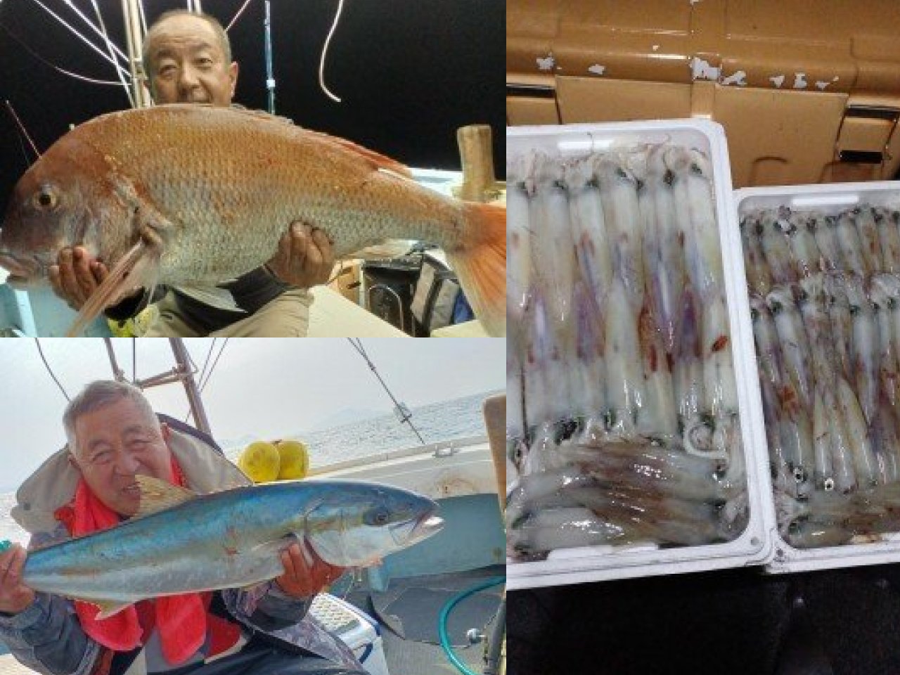 リレーにて乗船。前半五目釣で根魚の良型アオナ・アコウ等を釣りました。夜釣りではコンスタントにヤリイカとスルメイが釣れ、後半イカ泳がせにて3,4キロの鯛も釣れ大変満足でした。