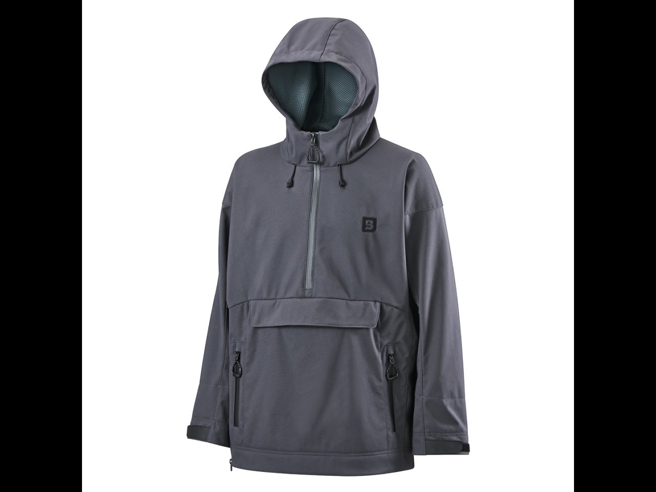 透湿防水生地を採用した羽織り易いプルオーバーフーディ。