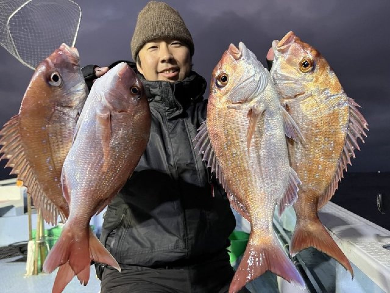 ・<午後マダイ船> 一つテンヤでのマダイ釣りです。波風&雨。アタリがわからなかったりバレてしまったり・・・と厳しい条件となってしまいましたが、コンスタントに型が見られました。