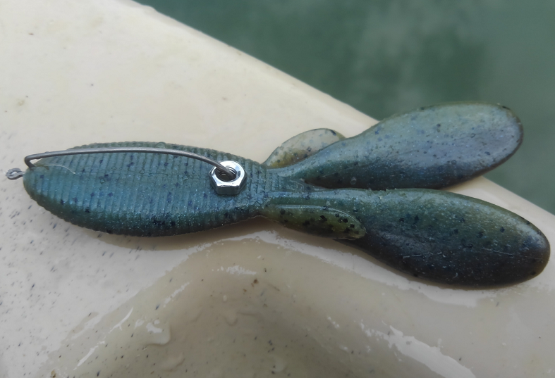 画像のような高比重でビッグパーツの付いたフラットフォルムのワームは、水によく絡んでくれます。