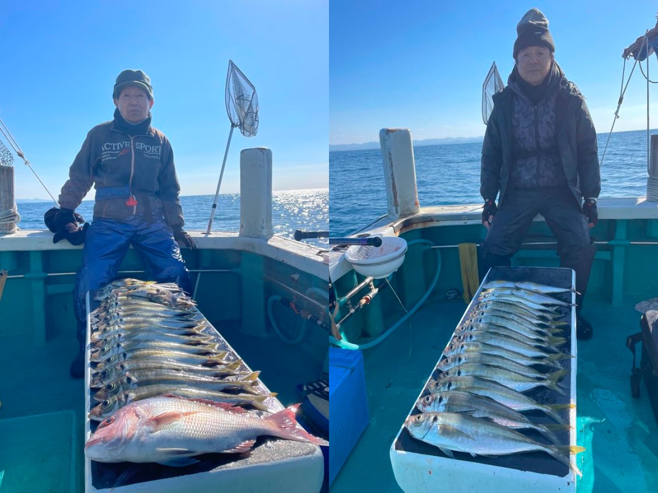 ・型良しマアジにイサギ混じりでお土産に!船長も真鯛にマアジ、イサギゲットでした。
